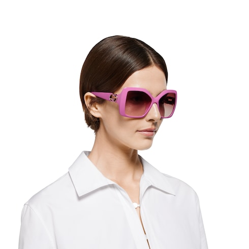La collection de lunettes Pre-Fall 2025 associe des silhouettes originales issues des archives à une touche contemporaine. Ces lunettes de soleil carrées sont dotées de verres roses effet dégradé et d’un détail logo GG enlacés ajouré en émail rose sur les branches.