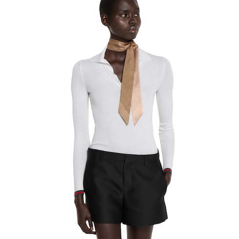 Les accessoires en soie de la collection Pre-Fall 2025 donnent vie aux codes de la Maison à travers des finitions sophistiquées, des empiècements logo et de délicates broderies. Ce ruban est confectionné dans un jacquard de laine et soie GG.