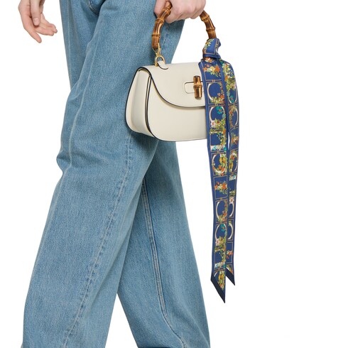 Les accessoires en soie de la collection Pre-Fall 2025 dynamisent les codes de la Maison à travers des finitions sophistiquées, des empiècements logo et de subtiles broderies. Confectionné en twill de soie, ce ruban polyvalent est orné d’un imprimé fleuri Gucci GG sur toute la surface.