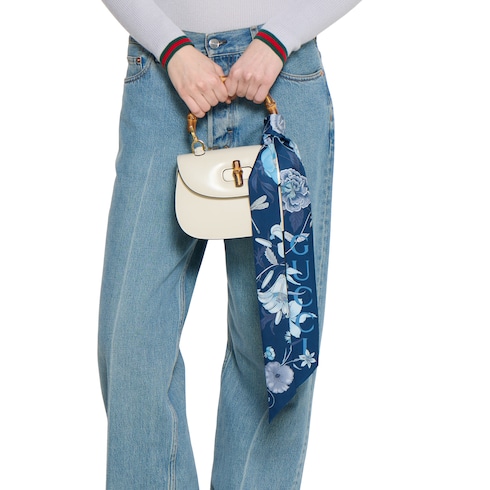 Les accessoires en soie de la collection Pre-Fall 2025 dynamisent les codes de la Maison à travers des finitions sophistiquées, des empiècements logo et de subtiles broderies. Confectionné en twill de soie, ce ruban polyvalent est orné d’un imprimé fleuri Gucci sur toute la surface.