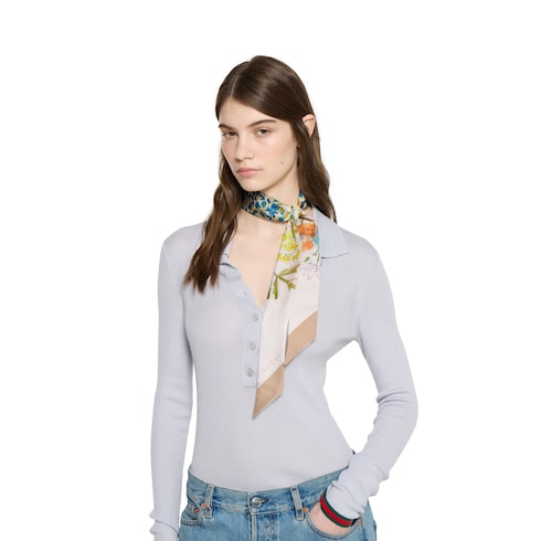 Présenté dans le cadre de la collection Pre-Fall 2025, ce ruban en twill de soie est orné d’un imprimé fleuri sur toute la surface. Le motif coloré représente un bouquet de fleurs, créant un effet aquarelle assorti aux tons de la collection.