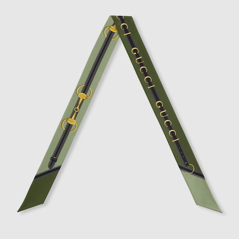 Pour la collection Automne-Hiver 2025, la Maison célèbre son héritage équestre, notamment à travers ce ruban en soie orné de l’imprimé Mors et ceintures Gucci sur toute la surface.