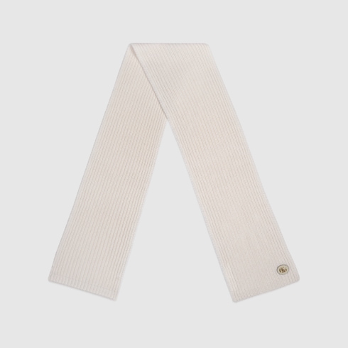 Présentée en ivoire, cette écharpe est confectionnée en cachemire et maille de laine côtelée. Le Double G, inspiré d’une boucle de ceinture des années 70, définit cet accessoire tel un empiècement en cuir.