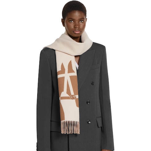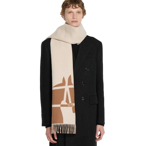 Les accessoires en soie de la collection Pre-Fall 2025 dynamisent les codes de la Maison à travers des finitions sophistiquées, des empiècements logo et de subtiles broderies. Confectionnée en laine coloris ivoire et beige, cette écharpe se caractérise par un motif jacquard équestre.