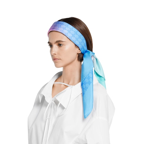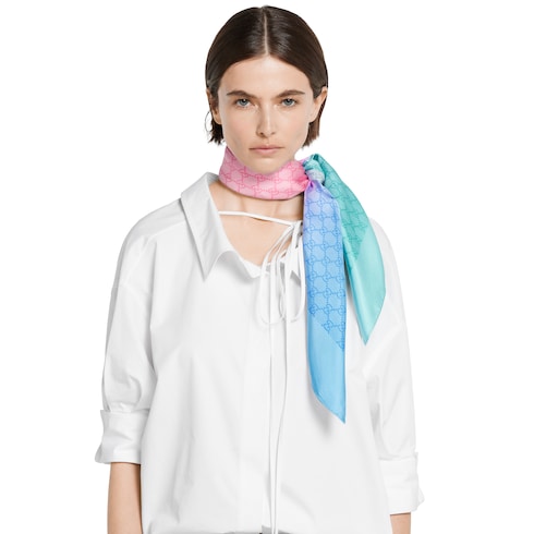 Orné d’une œuvre de l’illustrateur et animateur Yu Cai, qui associe techniques traditionnelles et innovation numérique pour explorer la vie urbaine, ce carré réinterprète le motif GG de Gucci dans le cadre du projet 90 x 90.