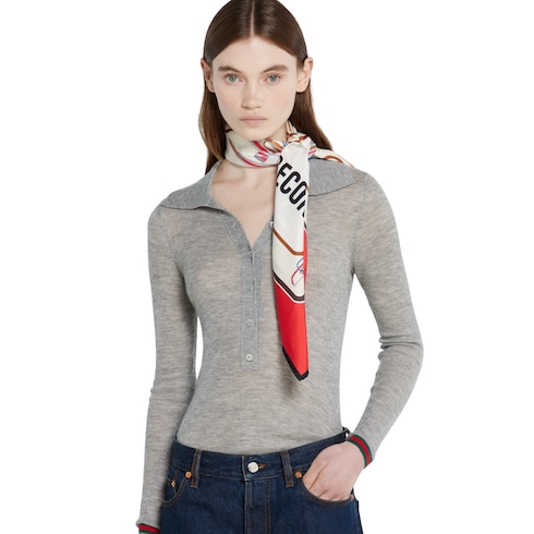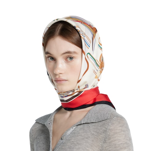 Rehaussé d’une création de l’artiste Sara Leghissa, dont l’œuvre questionne et approfondit le lien avec la réalité, ce carré réinvente un motif historique de Gucci dans le cadre du projet 90 x 90.