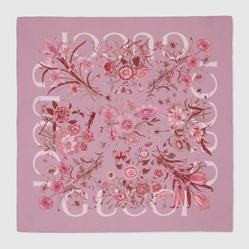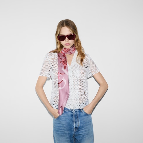 L’imprimé Flora historique est réinventé pour la collection Cruise 2025. Le motif caractéristique s’affiche sur une sélection d’accessoires en soie et d’accessoires tout en douceur dans des teintes pastel, pour un esprit romantique. Ce carré est présenté dans une soie rose avec un imprimé Flora Gucci, pour apporter une touche romantique à n’importe quel look.
