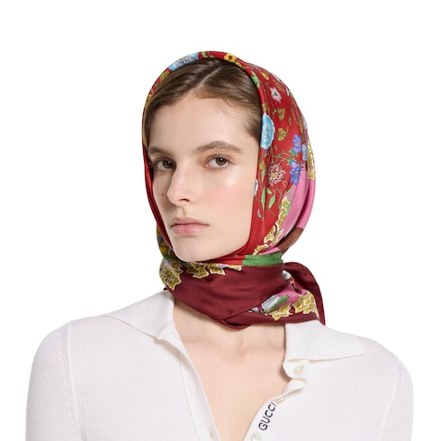 Présenté dans le cadre de la collection Pre-Fall 2025, ce carré de soie en twill de soie est orné d’un imprimé équestre et fleuri sur toute la surface.