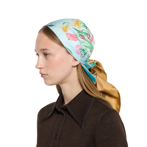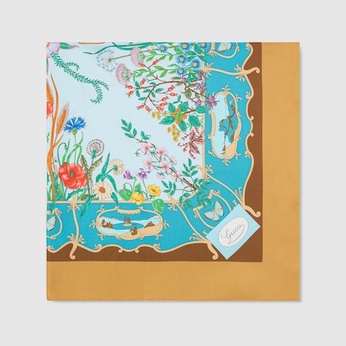 Pour la collection Automne-Hiver 2025, ce carré en twill de soie révèle un imprimé jardin italien Gucci sur toute la surface.