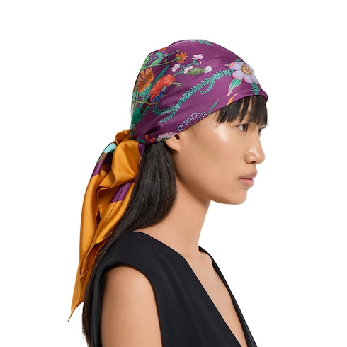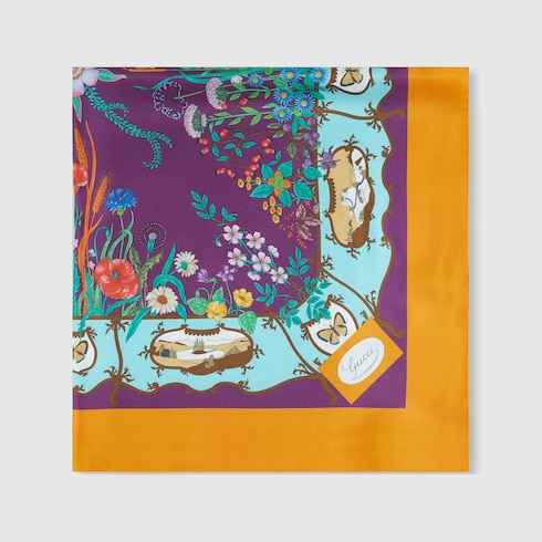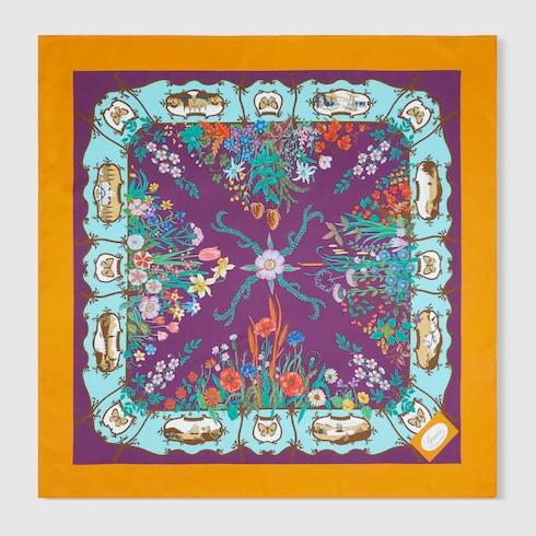 Pour la collection Automne-Hiver 2025, ce carré en twill de soie révèle un imprimé jardin italien Gucci sur toute la surface.