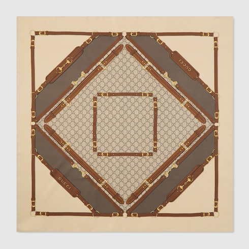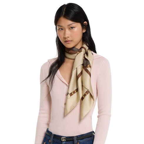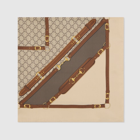 Pour la collection Automne-Hiver 2025, la Maison célèbre son héritage, notamment à travers ce carré de soie orné de l’imprimé Mors et ceintures Gucci sur toute la surface.