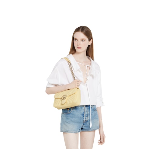 La collection GG Marmont emblématique de la Maison se caractérise par le détail Double G, une bandoulière chaîne à facettes et une construction souple en matériaux raffinés. Ce modèle est confectionné dans un denim à chevrons matelassés aux couleurs pleines de fraîcheur pour la saison.