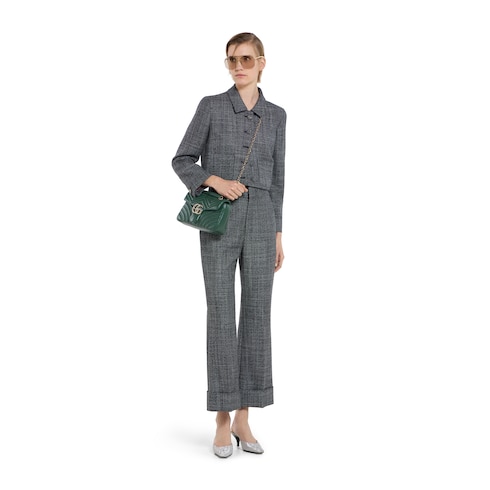 La collection GG Marmont, gamme emblématique de la Maison, présente le détail Double G, une bandoulière chaîne à facettes et un cuir à la souplesse exceptionnelle. La poche arrière discrète apporte une touche fonctionnelle aux versions moyen format et grand format.
