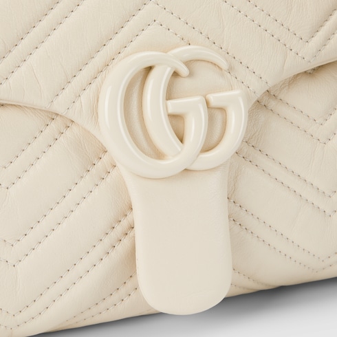 Pour la collection Automne-Hiver 2025, la collection GG Marmont emblématique de la Maison se caractérise par le détail Double G signature, une bandoulière chaîne à facettes et une structure souple. Confectionné dans un cuir matelassé léger et doux à chevrons, ce modèle est agrémenté d’un détail en émail ton sur ton et d’une chaîne.