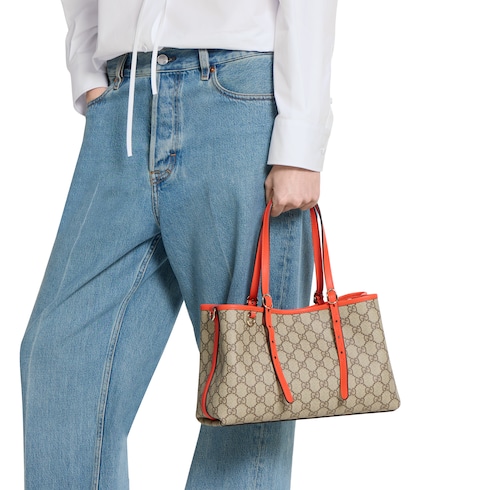 La collection GG Emblem réinterprète l’histoire de la Maison, faisant la part belle à l’élégance et au savoir-faire. Ce cabas présente des encoches numérotées sur les poignées réglables, une inspiration puisée dans le monde équestre.