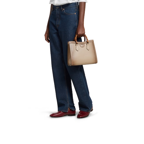 Le cabas Gucci Diana présente une poignée en bambou et un détail Double G. Ce modèle arbore des éléments emblématiques de la Maison sur un fond de cuir coloré à effet dégradé, agrémenté de deux bandoulières, l’une en cuir et l’autre en toile ornée de la bande Web.