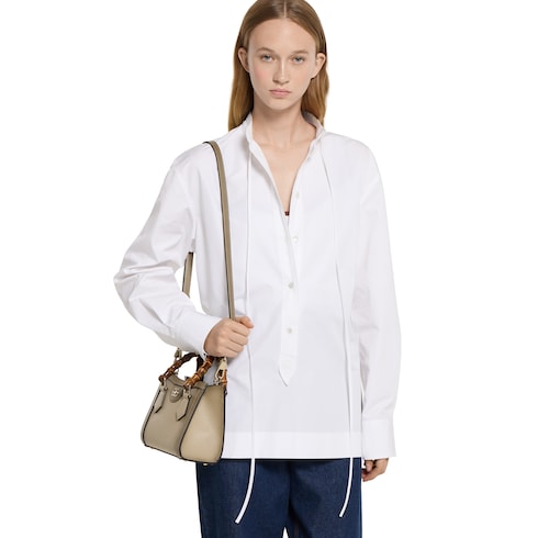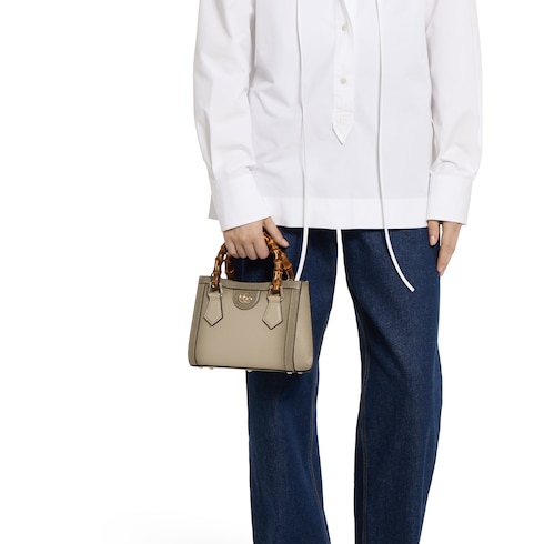 Pour la collection Pre-Fall 2025, Gucci Diana, l’une des gammes signature de la Maison, est présentée dans un cuir grainé en dégradé de couleurs et agrémentée d’une poignée en bambou. Le modèle cabas peut également être porté en bandoulière ou à l’épaule.