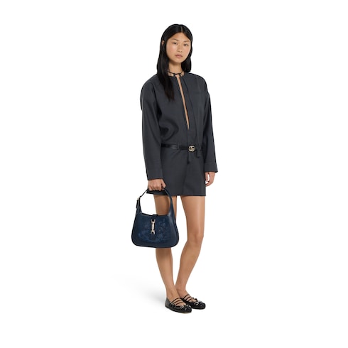 Pour la collection Pre-Fall 2025, ce sac Gucci Jackie 1961, confectionné en denim bleu foncé avec broderies florales, est agrémenté d’une fermeture à piston coloris doré clair et d’une bandoulière supplémentaire.