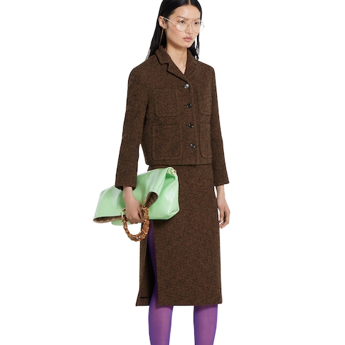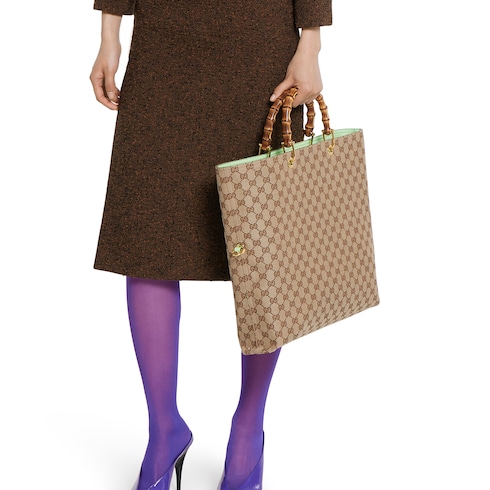 Pour la collection Automne-Hiver 2025, ce cabas réversible grand format est confectionné en cuir verni d’un côté et en toile GG signature de l’autre. Sa silhouette souple est rehaussée de poignées en bambou, tandis que sa pochette amovible ajoute à la polyvalence de son intérieur spacieux. Finitions dorées et bandoulière réglable.