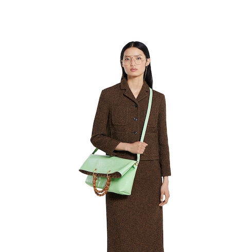 - Cuir verni vert menthe d’un côté, toile GG beige et marron foncé de l’autre