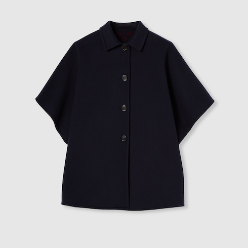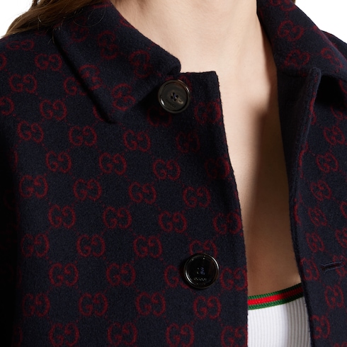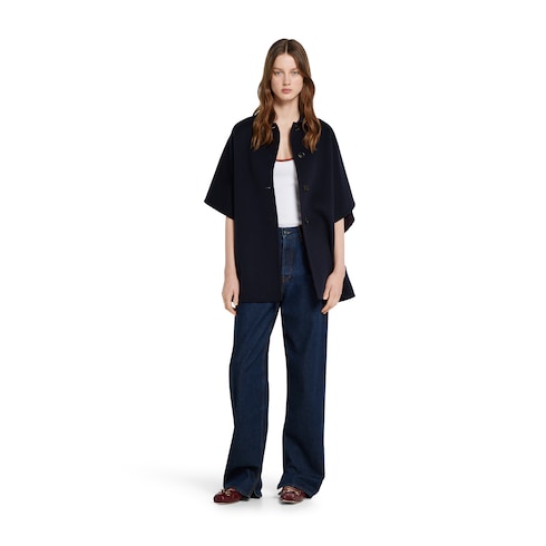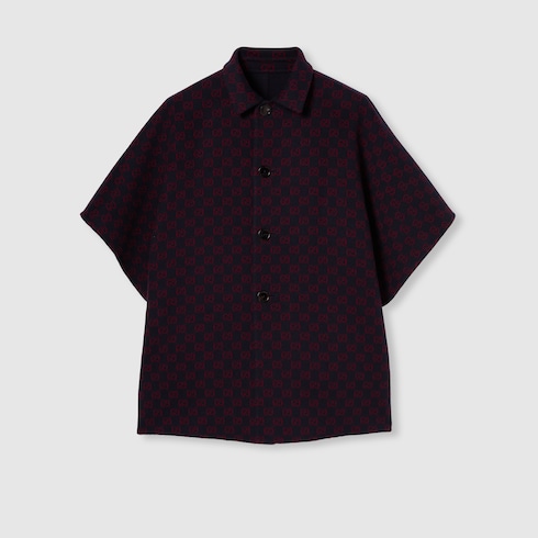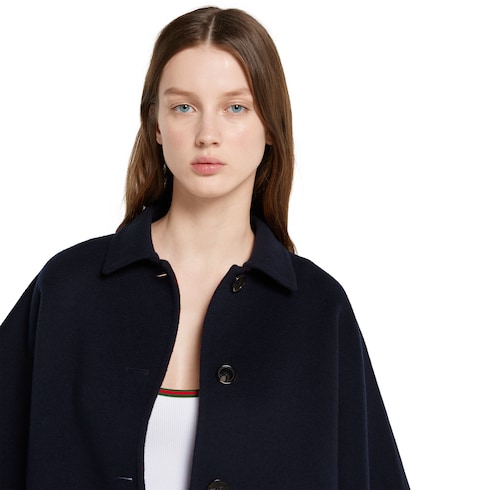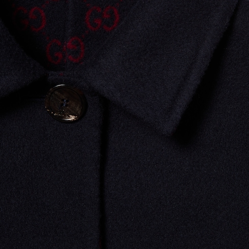 La collection Pre-Fall 2025 revisite les matières chaudes sur des vêtements d’extérieur raffinés et dotés de silhouettes traditionnelles et contemporaines. Ce manteau réversible à manches courtes larges se pare de laine et soie coloris bleu d’un côté et de laine et soie GG coloris bleu et rouge de l’autre.