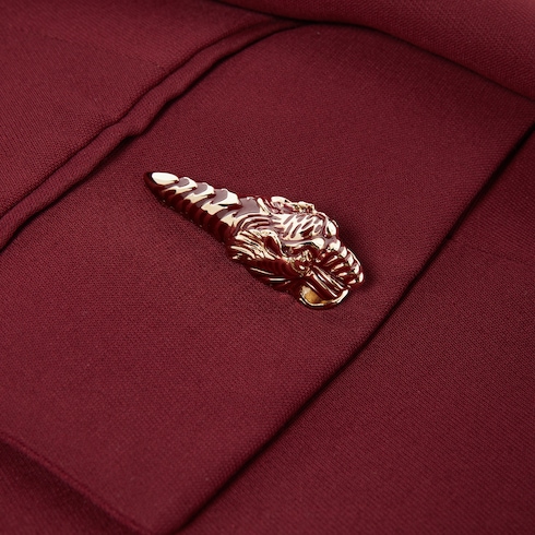 La collection Pre-Fall 2025 revisite les matières chaudes sur des vêtements d’extérieur raffinés et dotés de silhouettes traditionnelles et contemporaines. Cette veste à simple boutonnage en crêpe cady de laine et soie est ornée de la tête de tigre historique sur les deux poches avant.