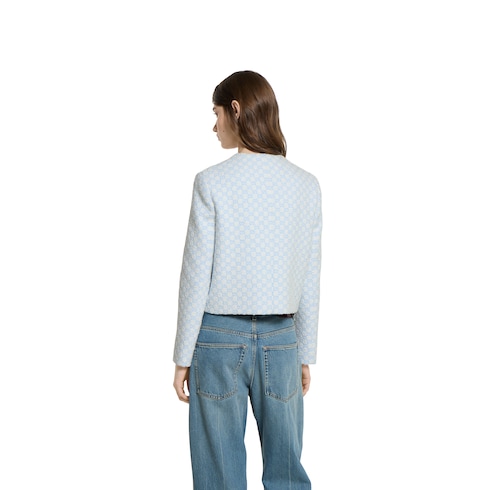Les sélections de la collection Pre-Fall 2025 mettent en avant des silhouettes incontournables avec des détails emblématiques, pour le jour comme la soirée. Cette veste sans col en coton bouclé GG ornée de boutons Double G rend hommage au monogramme immédiatement reconnaissable de Guccio Gucci, le fondateur de la Maison.