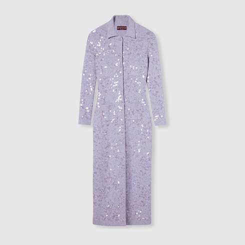 Pour la collection Pre-Fall 2025, des jupes et robes colorées confèrent aux looks de prêt-à-porter une touche d’audace pour la garde-robe de mi-saison. Cette jupe en jersey de viscose à la teinte délicate est agrémentée de la broderie Gucci. Cette robe en viscose fine à la teinte délicate est sublimée par une broderie en sequins sur toute la surface.