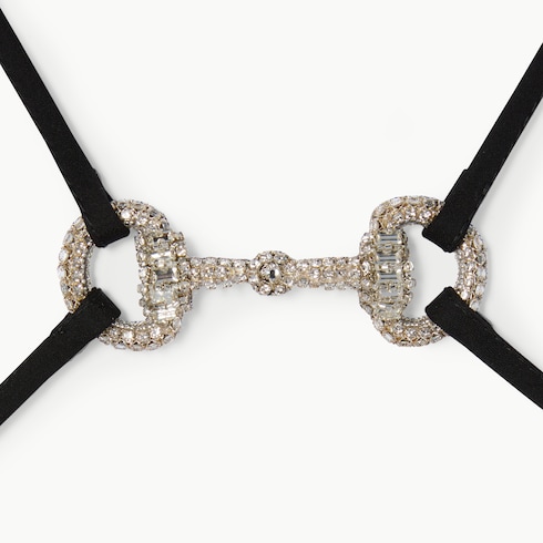 - Bretelles fines ornées d’un détail Mors avec cristaux à l’arrière