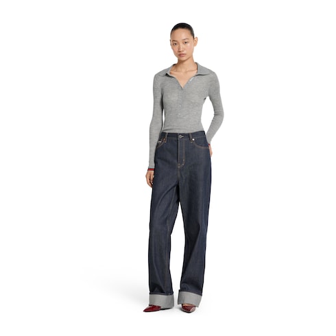 La collection Pre-Fall 2025 réinvente les silhouettes et les matières signature, rehaussant la garde-robe du quotidien. Ce pantalon en denim de coton est orné d’un liseré Gucci et d’une étiquette en naplak Gucci Rosso Ancora sur l’envers.