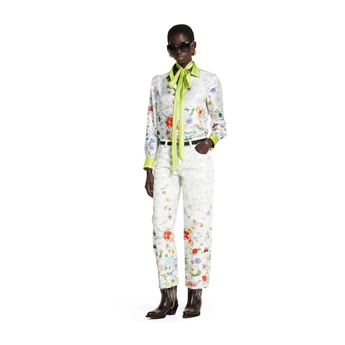 L’imprimé Flora issu des archives des années 60 prend vie sur les pièces de prêt-à-porter, explorant les teintes fraîches et les dégradés de la collection Pre-Fall 2025 avec une touche romantique. Il apparaît sur ce pantalon en denim et se fait de plus en plus présent à mesure qu’on s’approche de l’ourlet.