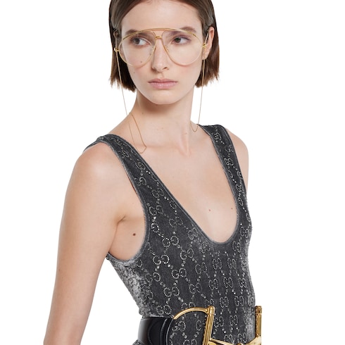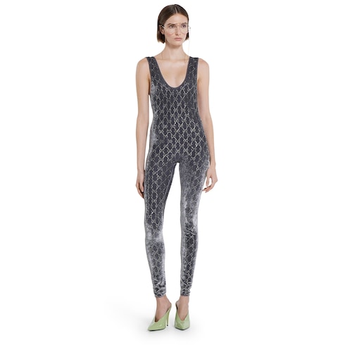 Pour la collection Automne-Hiver 2025, le chenille stretch est revisité avec une touche lumineuse. Cette combinaison est ornée d’une broderie en cristaux GG sur toute la surface, associant des codes emblématiques à une touche contemporaine.