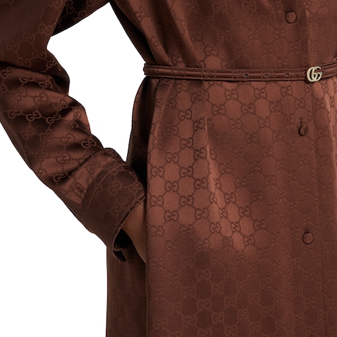 Des tons clairs aux teintes profondes, les pièces élégantes confectionnées dans des matériaux raffinés mettent en valeur les silhouettes sensuelles, sublimant la collection Pre-Fall 2025. Cette robe en satin GG est agrémentée de boutons sur le devant et d’une ceinture amovible avec boucle Double G.