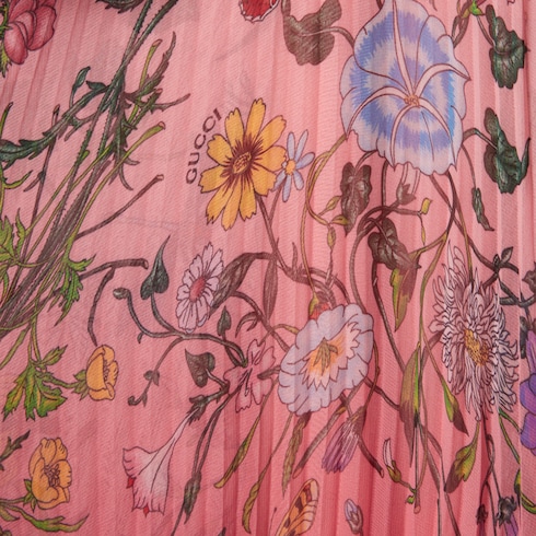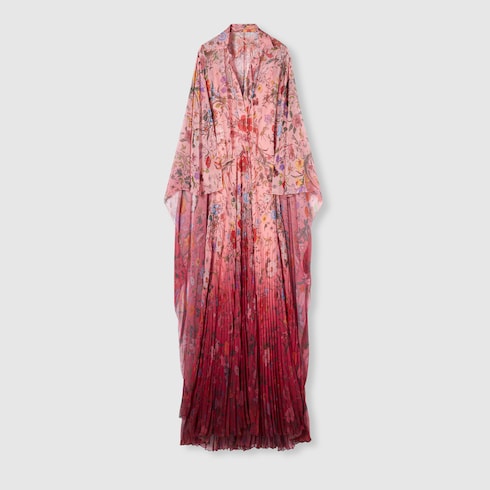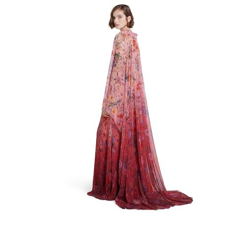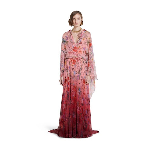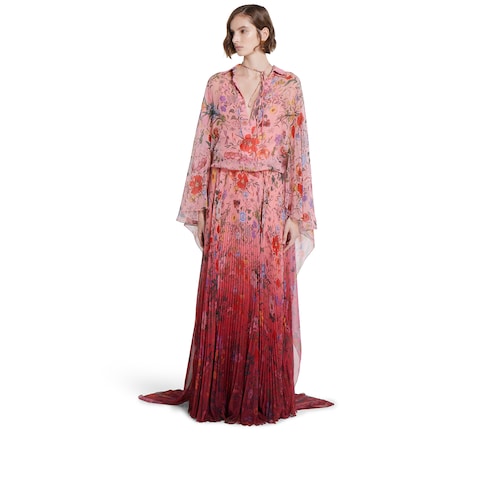 L’imprimé Flora issu des archives des années 60 prend vie sur les pièces de prêt-à-porter, explorant les teintes fraîches et les dégradés de la collection Pre-Fall 2025 avec une touche romantique. L’imprimé apparaît sur cette robe longue plissée en georgette de polyester, et se fait de plus en plus présent à mesure qu’on s’approche de l’ourlet.