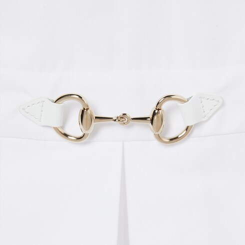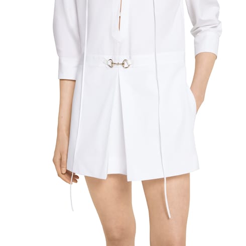 Une sélection de pièces de la collection Pre-Fall 2025 au ton monochrome et rehaussées de détails subtils, tels que des broderies ou des logos, parachève n’importe quel look, en journée comme en soirée. Cette robe chemise en popeline de coton est ornée d’un détail Mors en cuir au centre, tandis que l’encolure est rehaussée d’une bride de boutonnage.