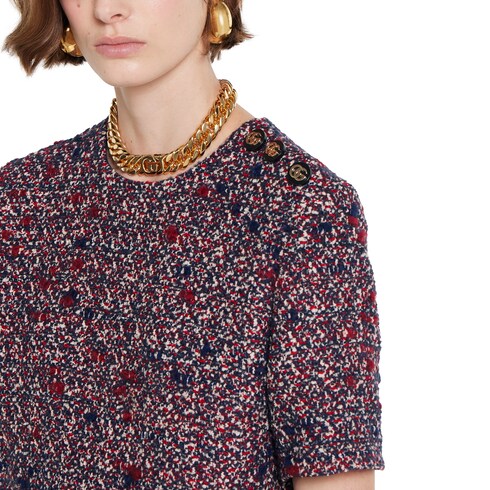 Les manteaux, vestes et robes associent élégance discrète et détails raffinés dans la collection Pre-Fall 2025. Cette robe en laine bouclée présente une allure chic caractéristique, accentuée par des boutons GG en émail doré.