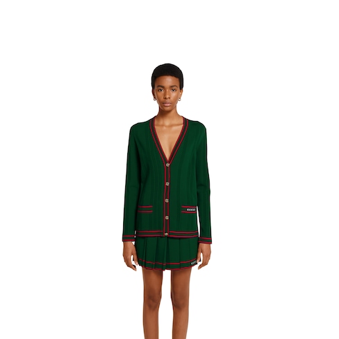 La Maison continue d’explorer le lien qui l’unit à l’univers du tennis depuis les années 70. Des pièces emblématiques mettent en valeur des détails intemporels, tels que la bande Web, ainsi que des matières innovantes. Ce cardigan en viscose fine est agrémenté de finitions à rayures rouges contrastantes et d’une broderie Gucci.