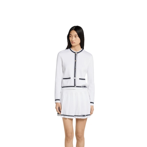 Parfaites pour le bord de mer, les créations d’inspiration marine rehaussent les silhouettes décontractées de rayures, de finitions contrastantes et de motifs signature au sein de la collection Pre-Fall 2025. Ce cardigan en coton surpiqué se caractérise par une finition nœud bleu en intarsia raffinée.