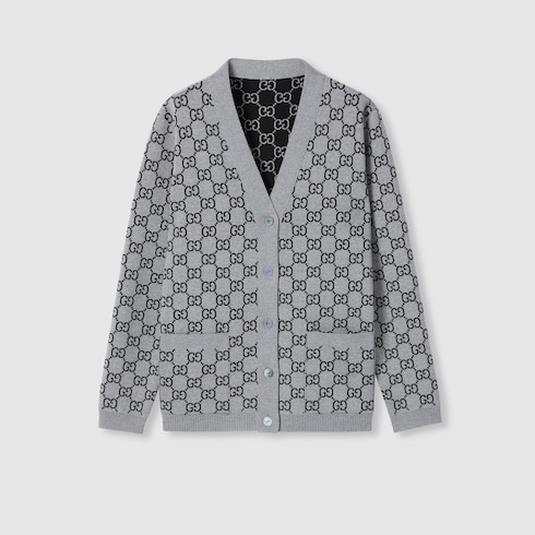Le motif GG se décline dans des mariages inédits de couleurs et de matières, du mélange de lin au nylon. Ce cardigan réversible à col en V est confectionné dans un jacquard de laine fine GG avec une palette de couleurs inversée sur l’envers.