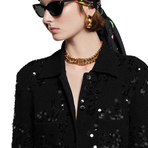 Découvrez de nouvelles pièces en tricot, avec des fils sophistiqués qui apportent du volume et des détails artisanaux qui mettent en valeur les textures riches. Mettant l’accent sur les fils, ces mailles peuvent être portées seules comme pièce maîtresse ou superposées, pour compléter la garde-robe Pre-Fall 2025. Ce cardigan polo en mélange de viscose est orné d’une broderie en sequins sur toute la surface.