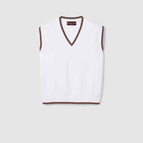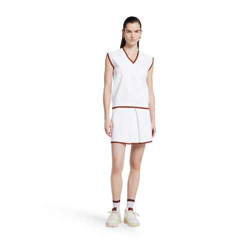 La Maison continue d’explorer le lien qui l’unit à l’univers du tennis depuis les années 70. Des pièces emblématiques mettent en valeur des détails intemporels, tels que la bande Web, ainsi que des matières innovantes. Ce gilet en viscose fine est orné de finitions bande Web vert et rouge.