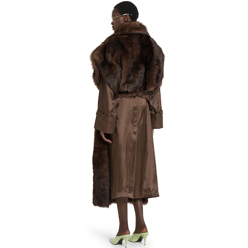Pour la collection Automne-Hiver 2025, ce long manteau en shearling est défini par des textures ton sur ton et une construction à empiècements graphiques. Des détails fonctionnels comme les boucles métalliques siglées et les œillets aux poignets complètent la ceinture amovible, renforçant à la fois la structure et la polyvalence de la pièce.