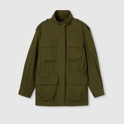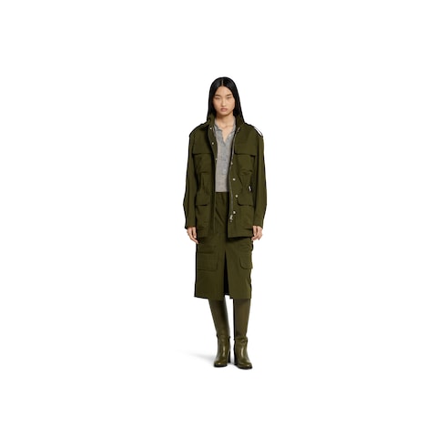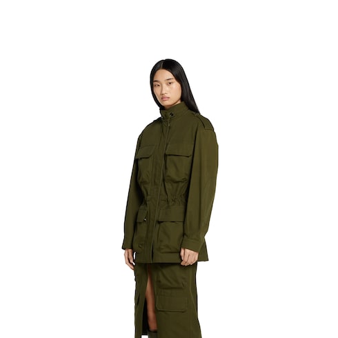 Le vert, fil conducteur du récit chromatique de la collection Pre-Fall 2025, s’exprime avec éclat à travers des textures variées, des détails logo et une palette de nuances, comme en témoignent les tenues présentées lors du défilé. Confectionnée en toile de coton léger, cette veste utilitaire présente une teinte vert forêt emblématique.