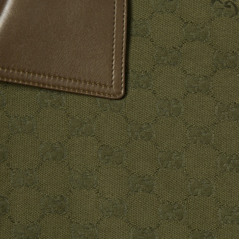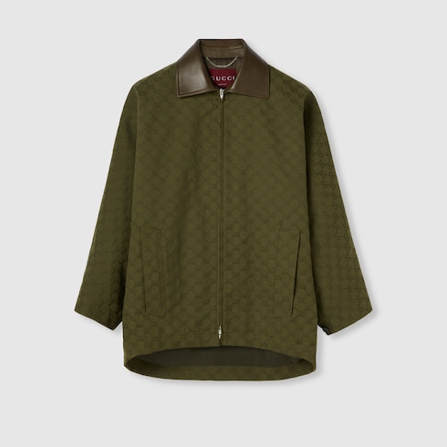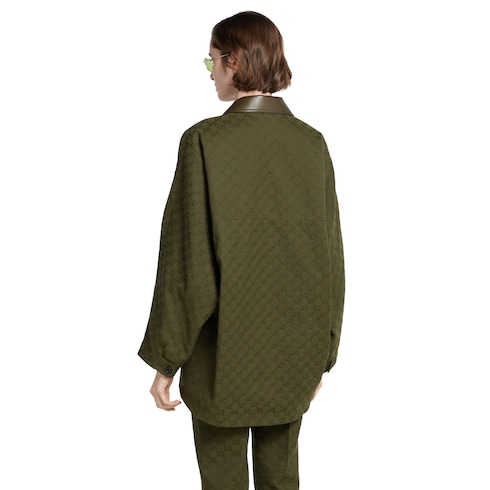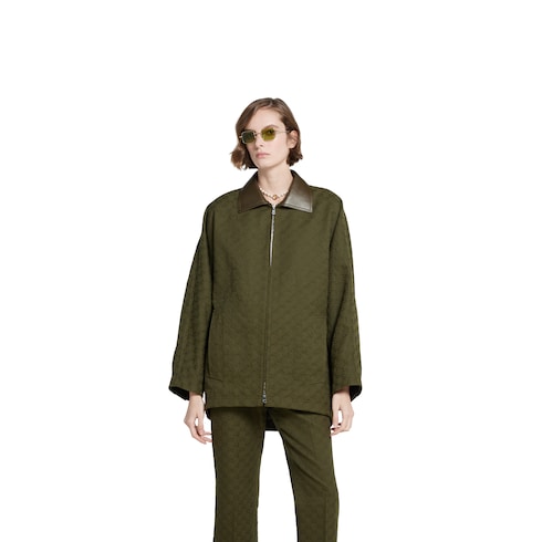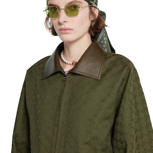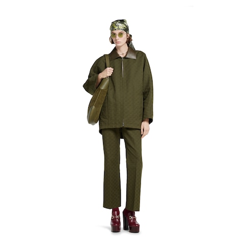 Le vert, fil conducteur du récit chromatique de la collection Pre-Fall 2025, s’exprime avec éclat à travers des textures variées, des détails logo et une palette de nuances, comme en témoignent les tenues présentées lors du défilé. Confectionnée en toile GG vert forêt emblématique, cette veste présente un col en cuir contrastant.