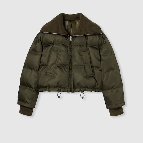 Le vert, fil conducteur du récit chromatique de la collection Pre-Fall 2025, s’exprime avec éclat à travers des textures variées, des détails logo et une palette de nuances, comme en témoignent les tenues présentées lors du défilé. Cette veste bouffante verte est confectionnée en gabardine de nylon fine, avec des finitions en maille et un détail logo Gucci en métal.