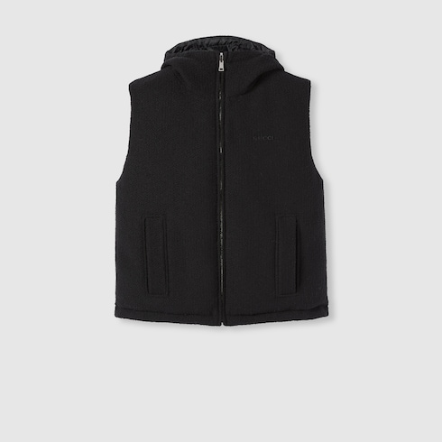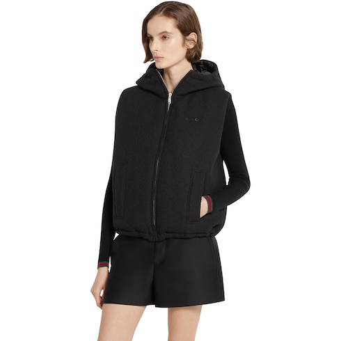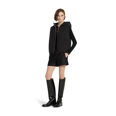 La collection Pre-Fall 2025 revisite les matières chaudes sur des vêtements d’extérieur raffinés et dotés de silhouettes traditionnelles et contemporaines. Cette veste sans manches réversible arbore de la laine bouclée sur un côté et du nylon GG de l’autre.
