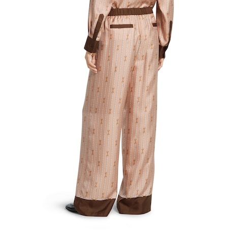 Pour la collection Pre-Fall 2025, des couleurs vives et des imprimés envoûtants confèrent aux looks de prêt-à-porter une touche d’audace pour la garde-robe de mi-saison. Ce pantalon en twill de soie se caractérise par un imprimé ceinture Mors Gucci sur toute la surface.