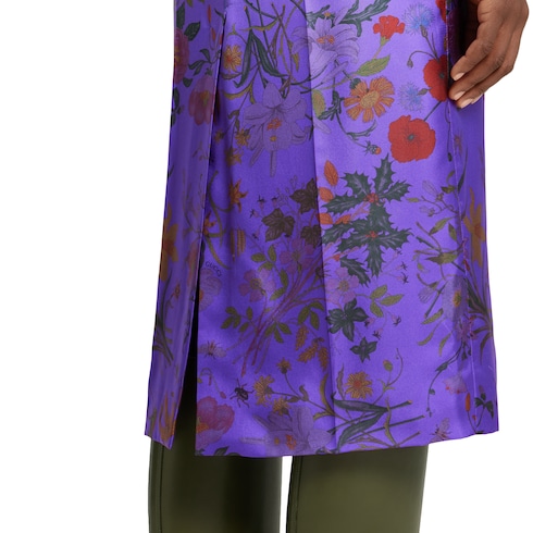 L’imprimé Flora issu des archives des années 60 prend vie sur les pièces de prêt-à-porter, explorant les teintes fraîches et les dégradés de la collection Pre-Fall 2025 avec une touche romantique. Il apparaît sur cette jupe en twill de soie et se fait de plus en plus présent à mesure qu’on s’approche de l’ourlet.