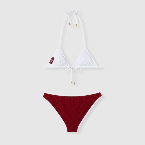 Ce bikini fait partie de la collection Pre-Fall 2025. Confectionné en jersey et tissu éponge GG rouge Gucci Rosso Ancora, il arbore des finitions blanches contrastantes. Un détail Double G orne la silhouette, laissant apparaître le logo de manière subtile.