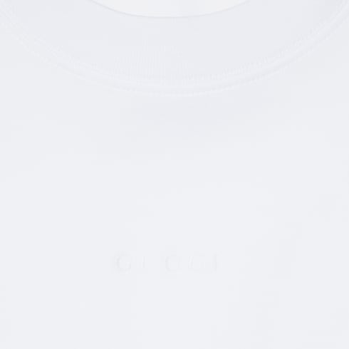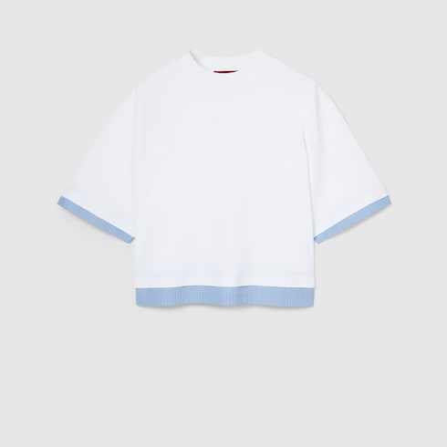 Parfaites pour le bord de mer, les créations d’inspiration marine rehaussent les silhouettes décontractées de rayures, de matières légères et de motifs signature au sein de la collection Pre-Fall 2025. Ce t-shirt en jersey est rehaussé de finitions en coton à rayures bleues.